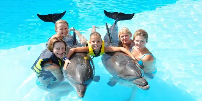 Die Hauptattraktion ist das Schwimmen mit den Delfinen im offenen Wasser, begleitet von erfahrenen Trainern. Sie werden von den Delfinen geführt und können verschiedene Tricks und Verhaltensweisen beobachten.