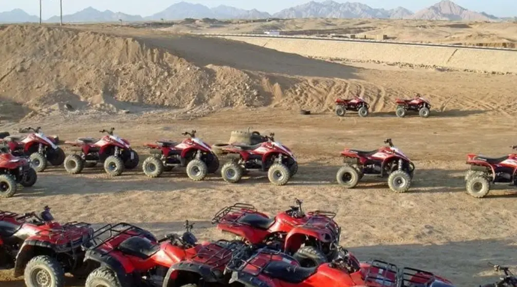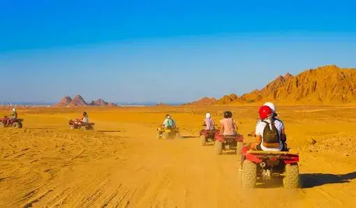For those seeking a more immersive and thrilling desert adventure, the Super Safari Trip (5 Hours) – Moto Quad with Dinner and a Party offers everything you need for an unforgettable day! Enjoy longer Moto Quad rides, a visit to a Bedouin village, camel rides, and end your adventure with a traditional dinner and an exciting desert party. Perfect for families and friends who want to add fun and excitement to their desert experience.