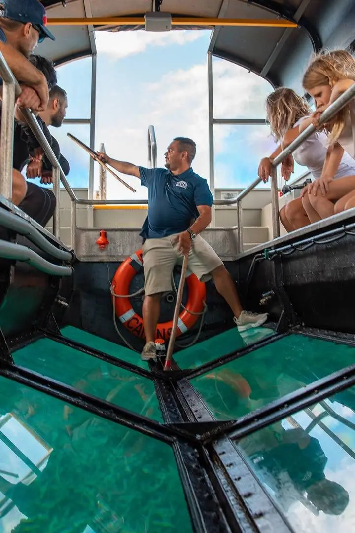 - Descend below sea level and enjoy clear panoramic views of coral reefs, fish, and marine life.